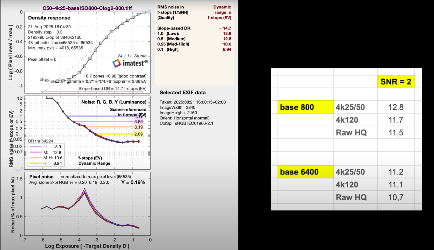 La dynamique mesurée en RAW parait plus basse que celle en 4K compressée. C’est logique car la 4K subit des traitements intégrés (réduction du bruit, amélioration de la netteté) qui améliorent artificiellement la perception de la dynamique.