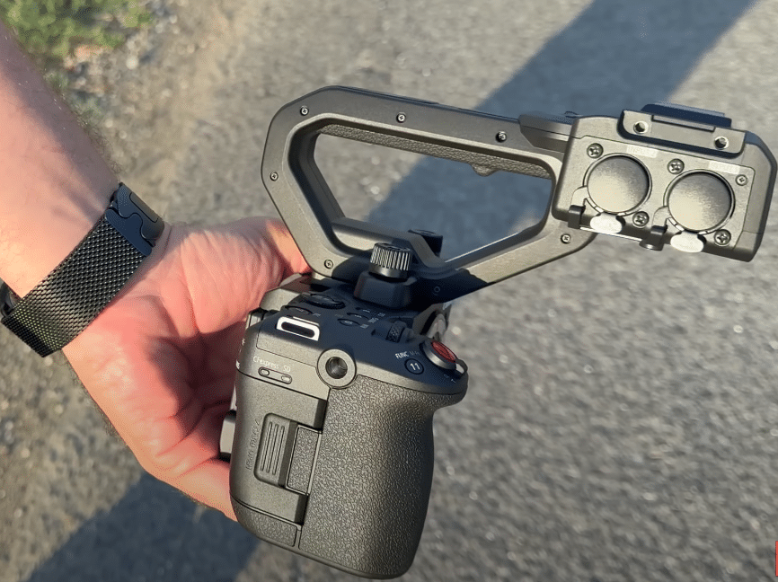 Comme chez Sony avec la FX3, Canon livre directement une poignée XLR dans la boîte. On y trouve deux entrées XLR 48V, un bouton REC supplémentaire et une commande de zoom.